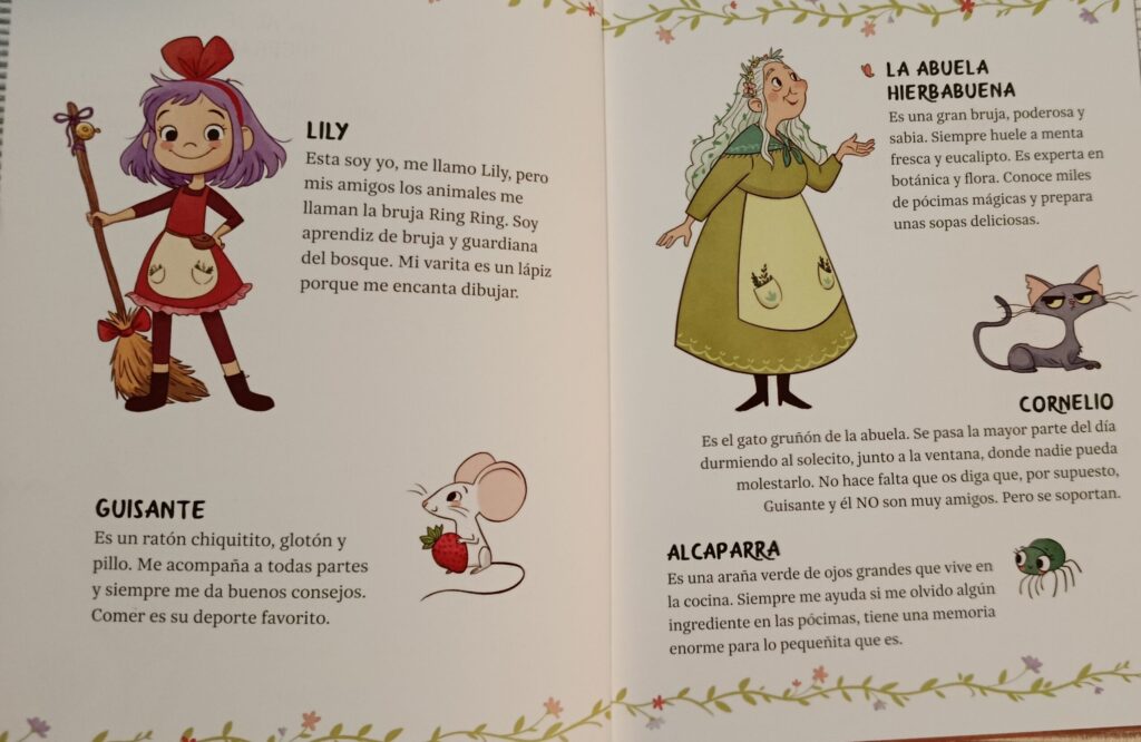 Desde la primera doble página, el libro nos abre la puerta a un pequeño universo mágico lleno de ternura y humor. Allí conocemos a Lily, una aprendiz de bruja que sostiene su escoba como quien sostiene un sueño: ligera, decidida, con esa mezcla de valentía y curiosidad que solo tienen los niños. Junto a ella aparece su peculiar familia: la abuela Hierbabuena, sabia y serena, con sus bolsillos llenos de recetas y plantas; Cornelio, el gato gruñón que vigila el mundo desde el ceño fruncido; Guisante, un ratoncito glotón que parece hecho de travesura; y Alcaparra, la pequeña araña de ojos enormes que todo lo recuerda. Esta presentación funciona como una invitación amable: antes incluso de que comience la aventura, el lector ya siente que ha entrado en casa de una familia entrañable, de esas donde las historias surgen solas.