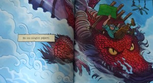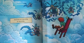Mientras tanto, el narrador visual  muestra todo lo contrario, una aventura llena de acción, criaturas fantásticas, persecuciones… Esta antítesis entre lo que se dice y lo que se ve, nos permite deducir que todo lo ilustrado pertenece a la imaginación del protagonista, despertando su mundo interior mientras, desde fuera, parece no estar haciendo nada interesante.